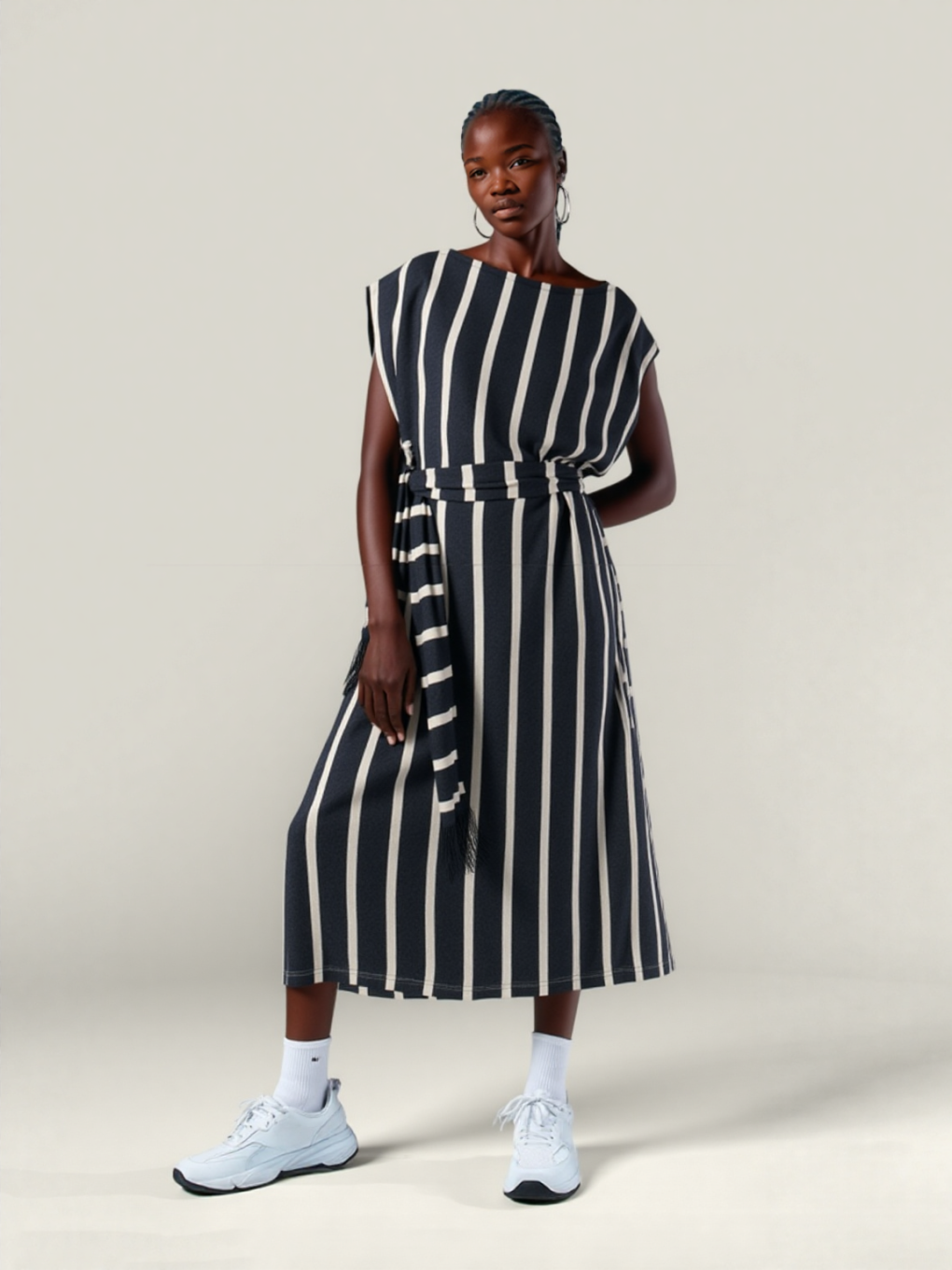 Lightweight knit with open sleeves and a fringes belt you can tie at the waist or wear as a statement necklace